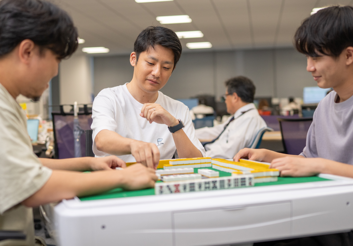イージスネットの遊び心を象徴するものとして、この全自動麻雀卓は欠かせません!麻雀が行われるのはだいたい金曜の業務終了後。さて、じゃあぼちぼちやりますか…という感じでいつもの面々が麻雀卓に集まり、熱中するあまり日付が変わることも日常茶飯事です。ちなみに社長は麻雀をやらず、熱中しているみんなの姿のを見るのが好き。興味があるけどやったことがないというあなた、仕事と同じくらい丁寧に教えてますよ!(笑)。