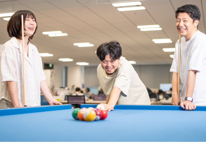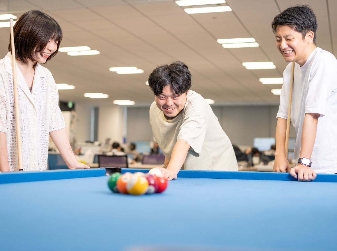 ITの仕事は、チームでの連携が不可欠。だから私たちは、部署や役職の垣根を越えたコミュニケーションを大切にしています。このビリヤード台は、そんな私たちの象徴かもしれません。ブレイクショットの音を合図に、自然と会話が生まれ、チームの絆が深まっていく。仕事も、遊びも、チームで楽しむ。そんな環境に、あなたも混ざってみませんか?