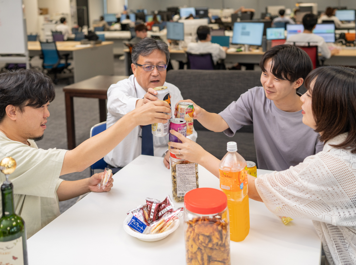イージスネットは社員のためにいろんな福利厚生が用意されていますが、これが一番ユニークな福利厚生ではないでしょうか。オフィスにお酒70%・ソフトドリンク30%がぎっしり詰まった冷蔵庫が用意されており、金曜の夜にもなれば仕事を終えた社員がぞろぞろと集まりプシュッと…。しかもなんとこの“居酒屋イージスネット”は社員だけではなく、一緒にプロジェクトを進めている協力会社のエンジニアが利用することがあるのです。とってもオープンな社風も自慢のひとつです!